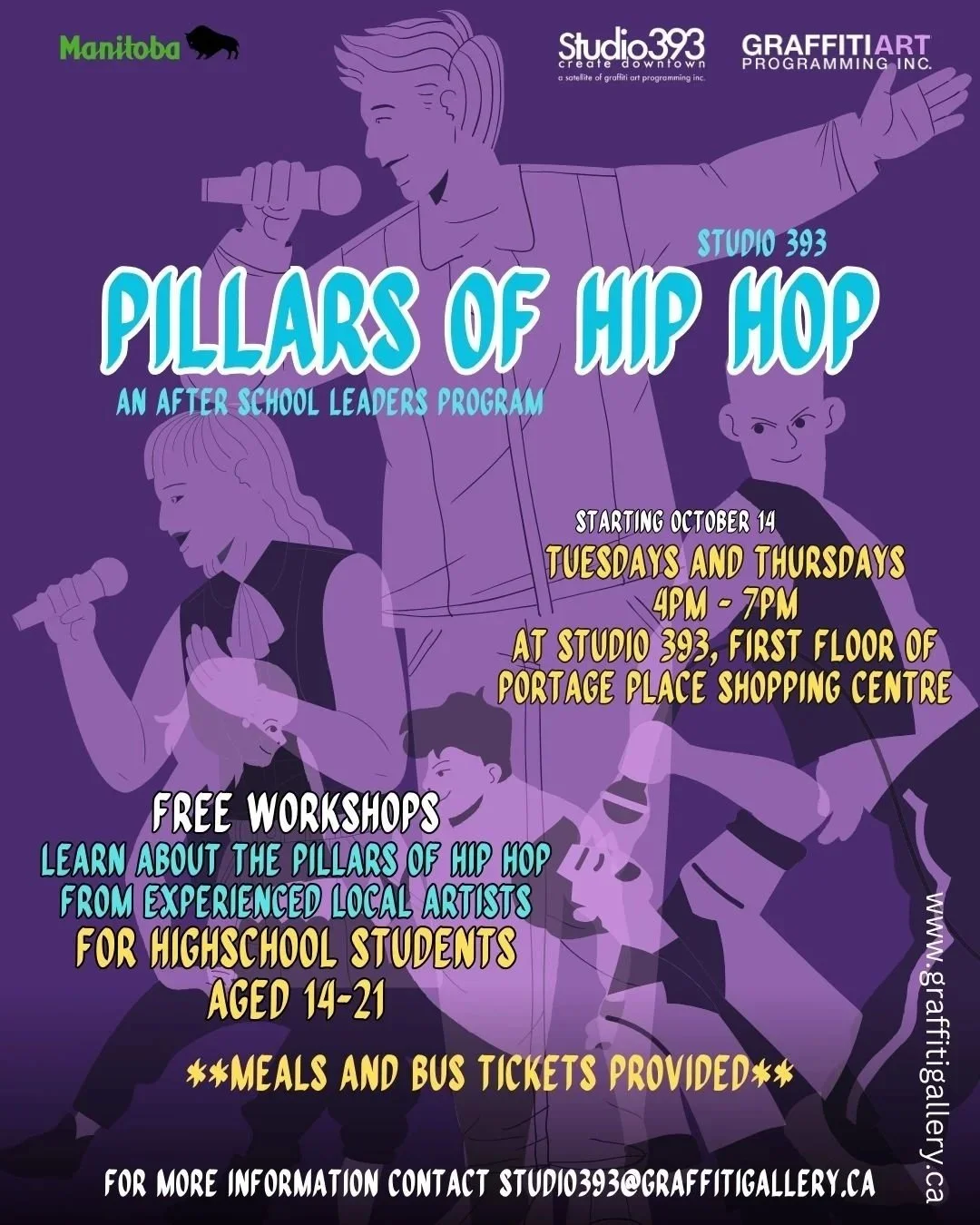 This program hosts FREE workshops for high school students aged 14-21. These workshops focus on the pillars of Hip Hop, while engaging youth in art workshops focusing on the art forms and culture of Hip Hop. Workshops are led by experienced and talented local and travelling guest artists. Following workshops that allow youth to learn and practice new art forms, the youth take control of our Studio 393 Podcast, and get to host an interview with the guest artists, before uploading the video to our media accounts.
